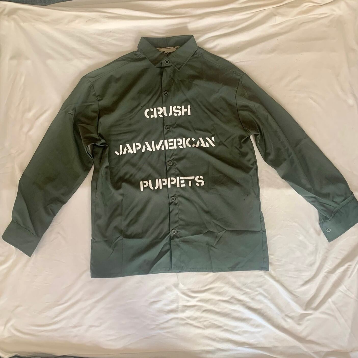 フロントには彼が掲げる「傀儡粉砕」の標語を英訳したものをプリントし、バックには2025年8月31日に開催されたUTEROZZZAAA 20周年記念式典「世界妄想博覧会」でのライブ風景をプリントしました。